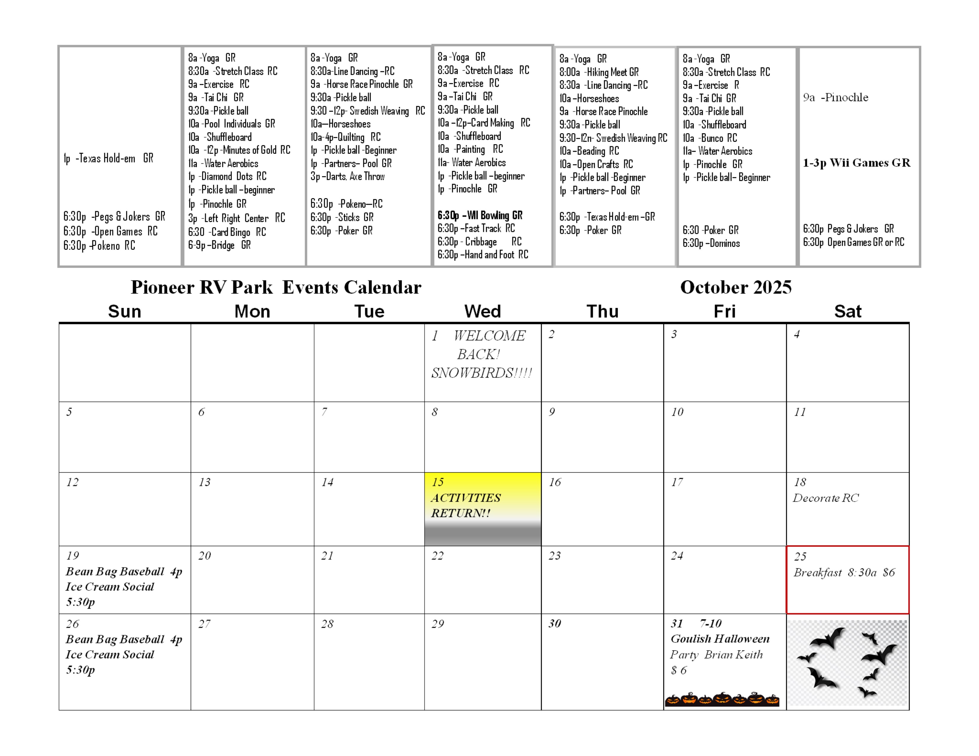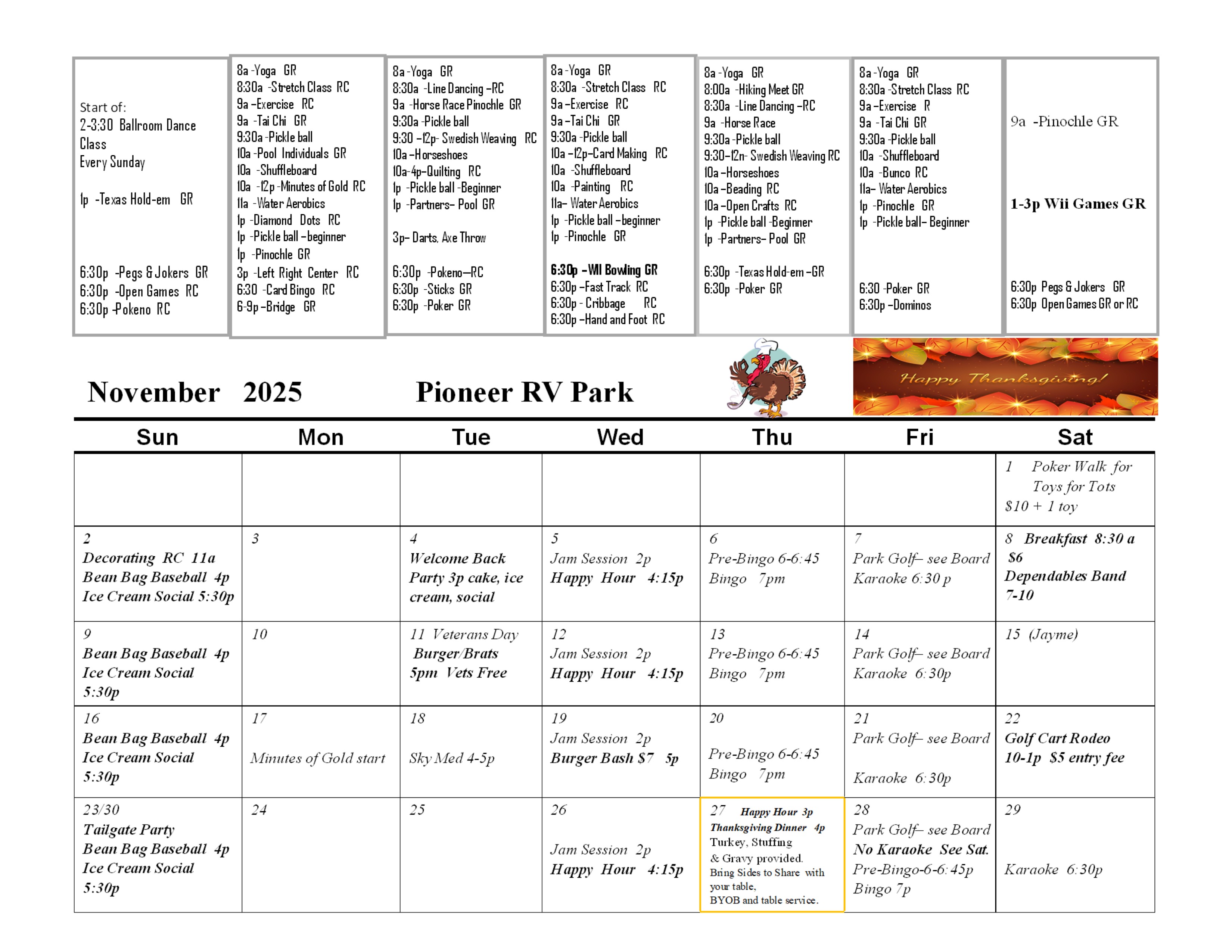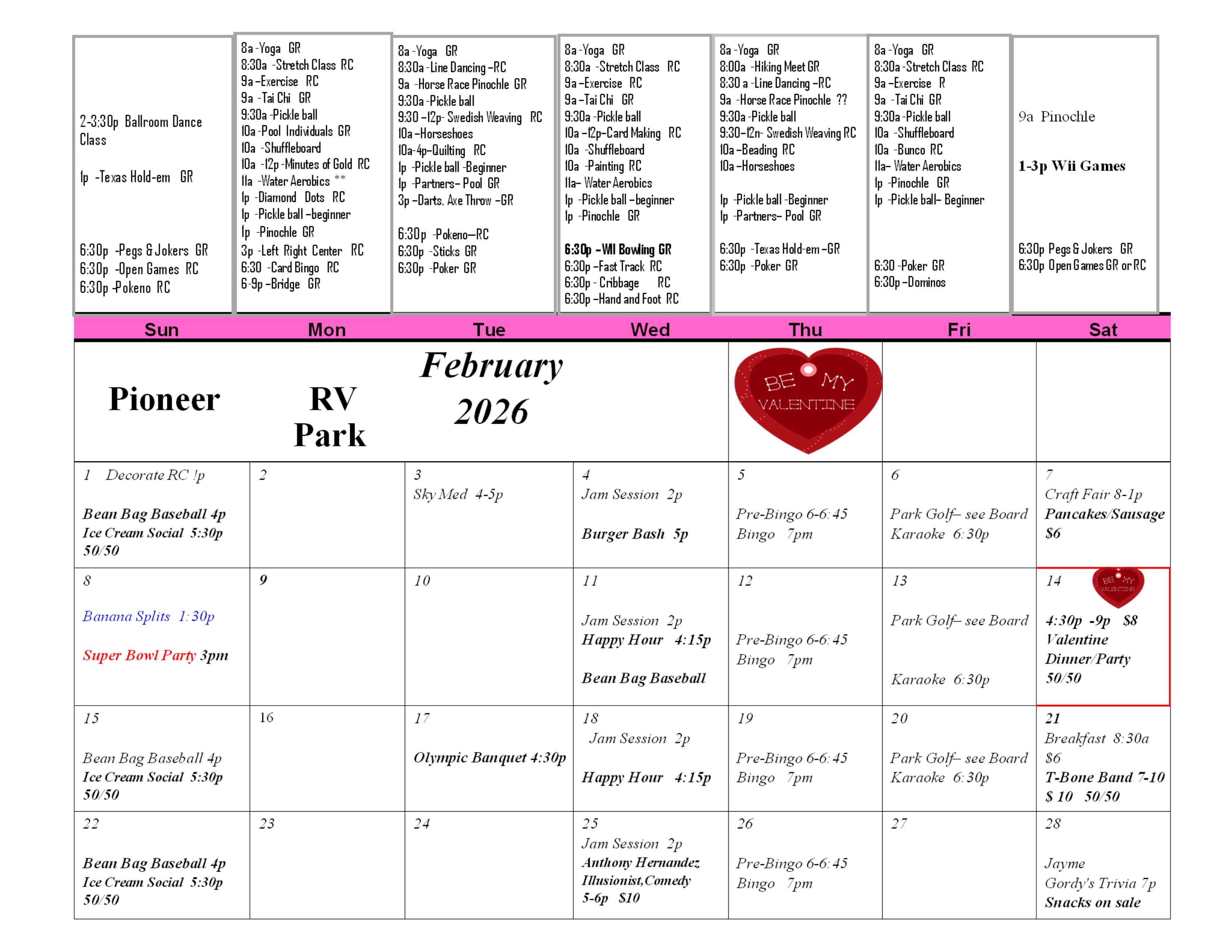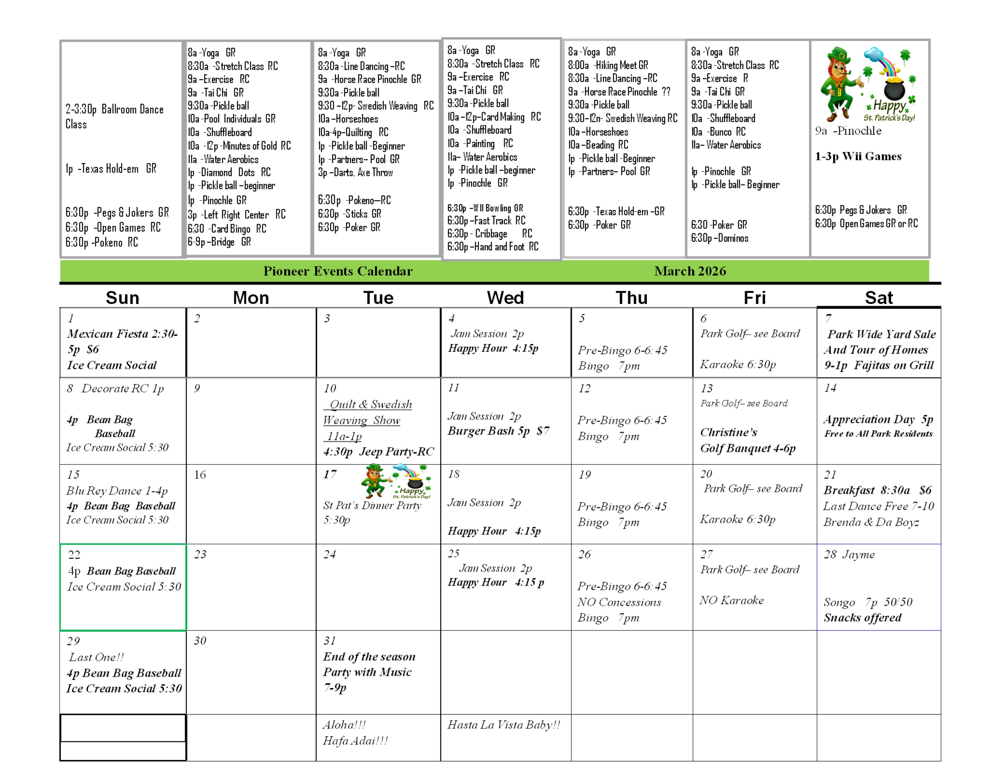 "My husband and I have spent the past 8 winter seasons in Weilton Arizona because we love the small agricultural community friendliness of both the local residents and the many winter visitors we have met through the years. We spent our first 4 winter seasons in one of the many RV Resorts in WeIlton before we decided to move our RV to Pioneer RV Resort. It was one of the best decisions we have ever made. We love the large RV spaces, the daily and evening activities, holiday and special dinners, dances, and weekly and monthly events. And, because Pioneer RV Resort's managers, activity directors, and all staff and resident volunteers are the ones who make this a special place to many of us who call it "home" for the winter seasons, my husband and I have decided to make Pioneer RV Resort our permanent residence. "